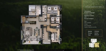Este departanto cuenta con 173.13m2 de interiores +14.61. de balcón, 3 recámaras, recámara principal con amplio baño y vestidor, recámara secundaria con excelente closet, otro baño completo que da servicio a la 2a recamara y estancia, cuarto de servicio, cuarto de lavado y 2 estacionamientos.