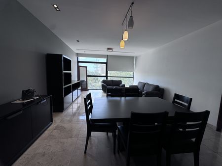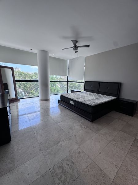 Departamento de lujo en renta, con ubicación privilegiada, con amenidades y vista panorámica de la ciudad. Recámaras con camas y closets, cocina integral y amplios espacios en sala y comedor.