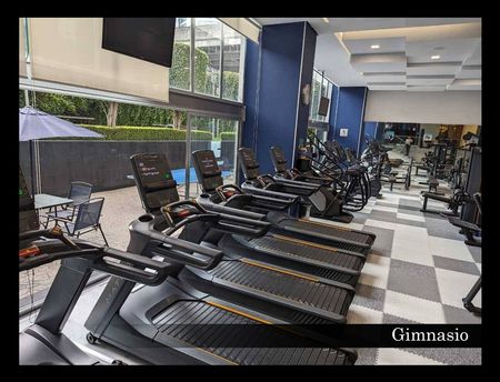 Gimnasio, 2 albercas (una templada en piso 16 con terraza panorámica y restaurante, otra con carril de nado y chapoteadero), cancha de pádel, spa, salón de eventos, cine, ludoteca, jardines con asadores, salón de adultos, lavandería y mini súper.