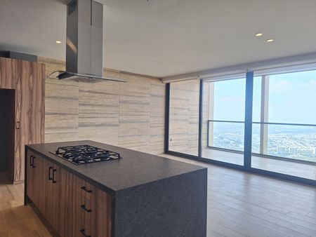Departamento en 15° piso, con vista panorámica, sala-comedor con salida a terraza, cocina abierta con barra de granito, doble tarja parrilla campana y horno. Area de lavado cerrada, baño de visitas, sala de TV abierta, 2 recámaras, master suite con vestidor, baño y salida a terraza. Recámara secundaria con baño, closet y salida a terraza.