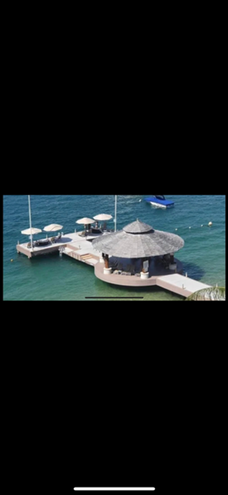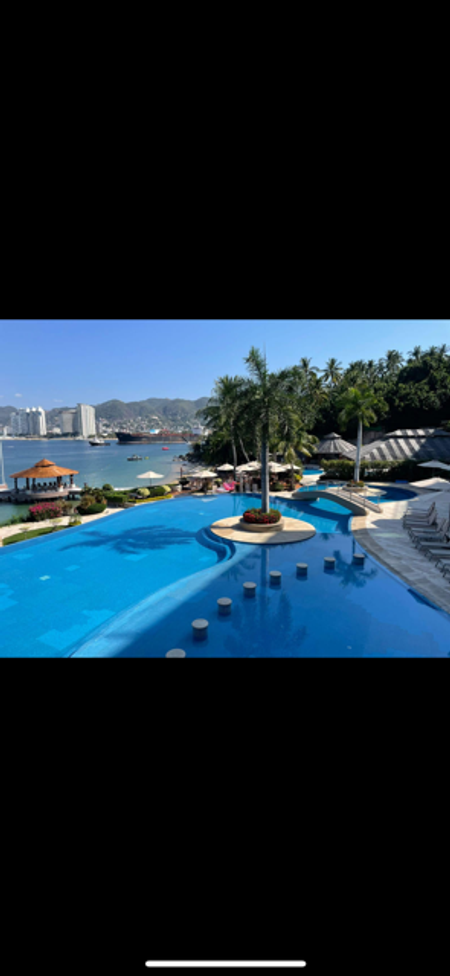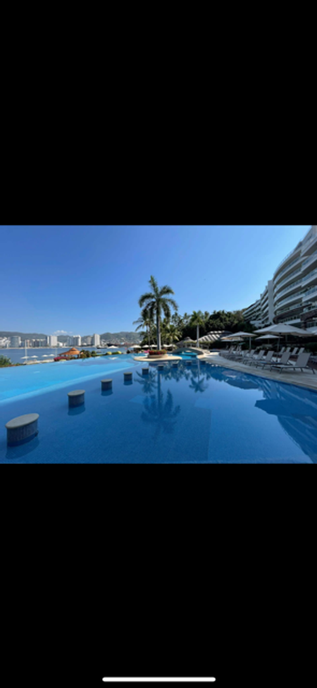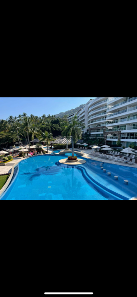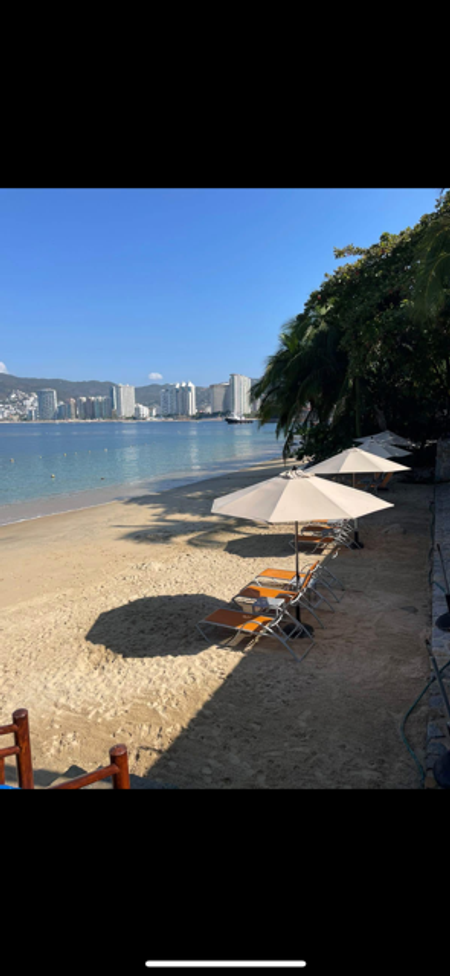 Área de camastros en albercas y área de playa privada y muy tranquila