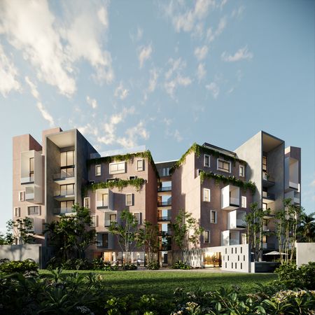 Desarrollo de 70 departamentos inspirado en un estilo de vida relajada, buscando transmitir desde el acceso al edificio la sensación de libertad y momentos de felicidad al acompañar tu recorrido siempre rodeado de área verde, sin importar el punto en el que te encuentres dentro del complejo.