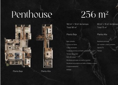 Este excelente departamento tipo Penthouse cuenta con 181m2 de interiores+19.30 de terraza balcón en PH y en piso 2, 60.65m2 interiores+15.55m2 de espacio abierto, haciendo un total de 257.60m2 TOTALES , distribuídos en sala-comedor, cocina con barra, cuarto de lavado, cuarto de servicio con baño completo, terraza con asador, baño de visitas, 3 recámaras con baño y vestidor cada una, baño en roofgarden, 2 estacionamientos y bodega.