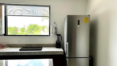Sofá, mueble de m adera con 6 cajones, Tv, comedor de madera con 6 sillas, estufa, refrigerador marca teka, microondas, 2 sillas altas, cama. cómoda con 6 cajones, lavadora LG, calentador eléctrico, lámpara, aire acondicionado inverter, mosquiteros, ventildores, persianas,