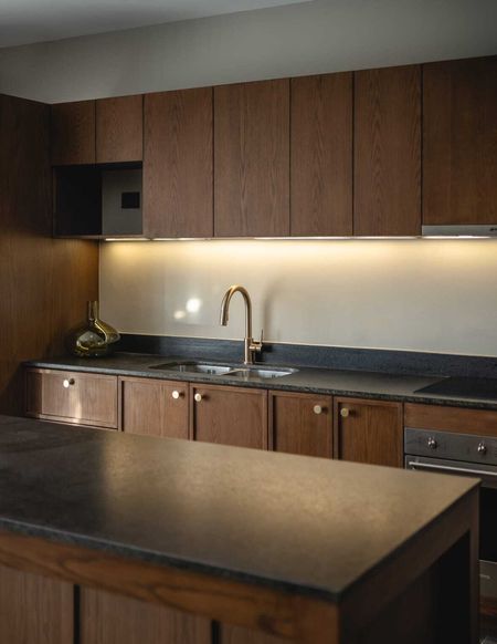 Cocina integral con horno, campana, parrilla eléctrica y doble tarja marca Esmeg