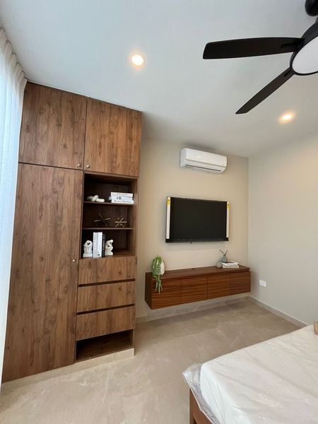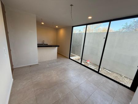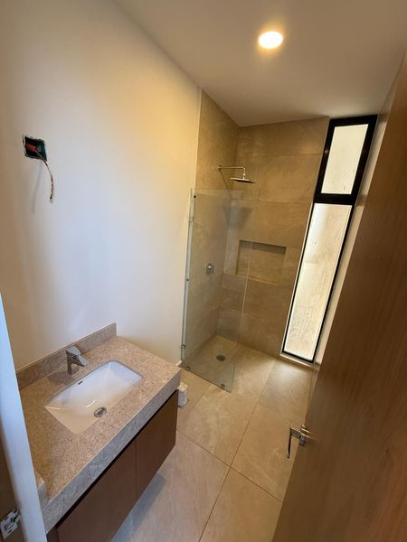 Equipamiento: parrilla eléctrica, calentador eléctrico, carpintería inferior en cocina, closets semi vestidos, cancel fijo de cristal templado, portón eléctrico, pisos 50 x100, granito negro San Gabriel en meseta de cocina, puertas de triplay de tzalam, muros acabado yeso.