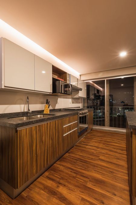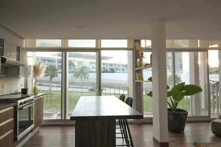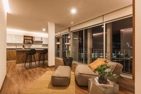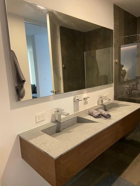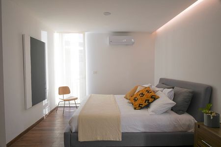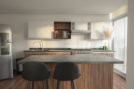 El espacio consta cocina equipada , barra desayunador y cocina en un espacio lineal, con un balcón que aporta luz a toda el área social, el área de sala con un escritorio designado como studio, medio baño de visitas que te conduce al Hall de TV terminando al fondo con la recamara con su baño completo.