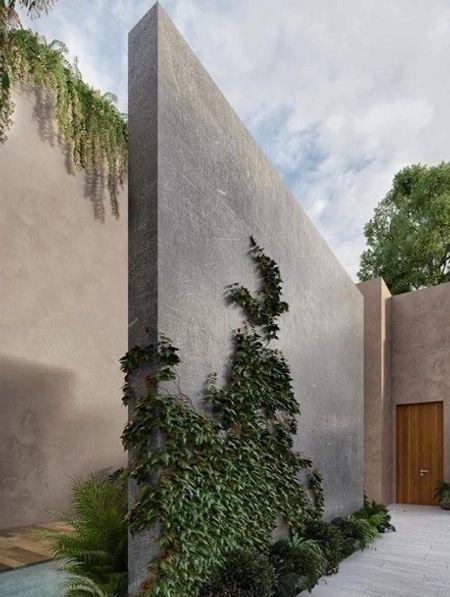 Muros funcionan como pantallas escultórica para resguardar en área de alberca compartida y configurar el patio central.