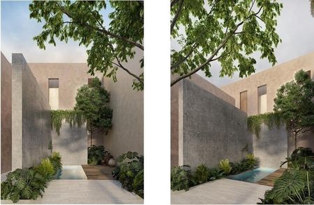 Conjunto de cinco viviendas que comparten área comunes que permiten el encuentro entre los residentes, ademas de funcionar como filtro para la intimidad y privacidad de cada una de las unidades. las circulaciones se encuentran rodeadas de vegetación donde aparecen árboles y terrazas.