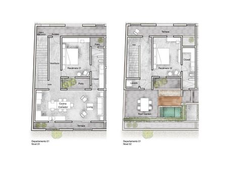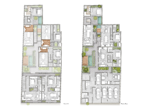 estacionamiento, bodega y áreas técnicas; en planta alta se encuentran un par de departamentos con roof garden.