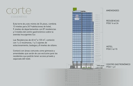 13 niveles para 247 habitaciones de hotel, 9 niveles de departamentos con 87 residencias y 2 niveles del centro gastronómico sobre la avenida Insurgentes Sur.