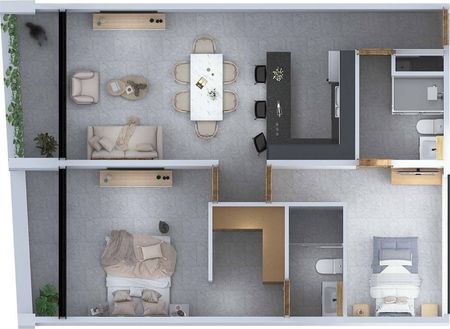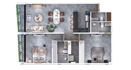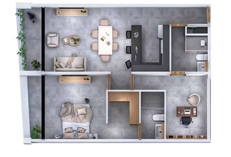 - **Estilo Moderno y Elegante:** La estética minimalista y contemporánea utiliza una paleta de colores gris y materiales como concreto pulido, acero y vidrio, proporcionando un aspecto sofisticado y atemporal.