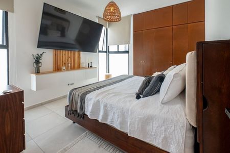 La recámara principal ha sido diseñada para tu máximo confort, con un mueble de cama personalizado que se adapta a tus necesidades. Además, cuenta con un mueble de TV personalizado, un tocador y un amplio closet, proporcionándote todo el espacio que necesitas para organizar tu ropa y accesorios. La recámara secundaria también incluye un closet, asegurando que tengas suficiente espacio de almacenamiento.