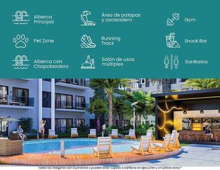 Alberca principal, Alberca con chapoteadero, Área de palapas y asoleaderos, Gym, Pet Zone,