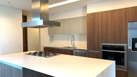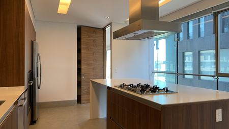 - Cocina cerrada: Diseñada con acabados de mármol y madera, equipada con cocina integral italiana, despensa amplia y línea blanca alemana.