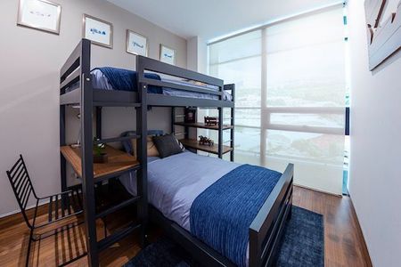 Además de destacar por sus amenidades principales como: Gimnasio, Salón de usos múltiples, Guardería de mascotas, lugar para bicicletas y motos, Eco-working, Lobby, Alberca con asoleaderos, Sky garden, Jardín Mezzanine, Cancha de paddle tennis, pista de correr, zona comercial, juegos infantiles y asadores.