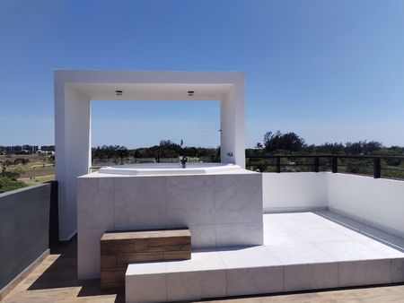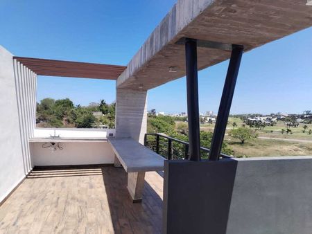 Casa departamento cuenta con 2 recámaras principal con vestidor, 2 baños completos, sala comedor, cocina integral con barra desayunadora, medio baño de visitas, balcón con vista al Club de Golf Dos Riveras y garage para un auto
