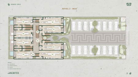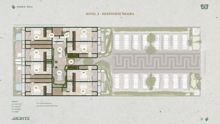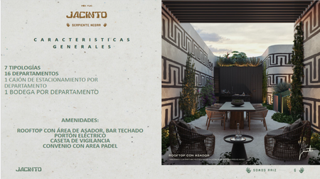 El desarrollo cuenta con Orientación Sur-Norte y se comporta por medio de 16 deptos en 3 niveles con 7 tipologías diferentes, un área de estacionamiento con bodegas y un roof top como amenidad en el nivel 3.