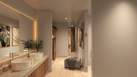 Muebles bajo cubierta en baños con madera triplay de caobilla.