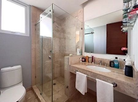 Hermoso departamento super ubicado, consta de 110 m2 habitables y 30 m2 de terraza, se encuentra en el 5o. piso Torre A, con vista contrario a la supervia , 2 recámaras con baño completo , cuarto de servicio con baño completo, medio baño de visitas, bodega, 2 lugares de estacionamiento (no se estorban), Gimnasio, Spa, Vapor, Ludoteca , Alberca , Cancha de Pádel.