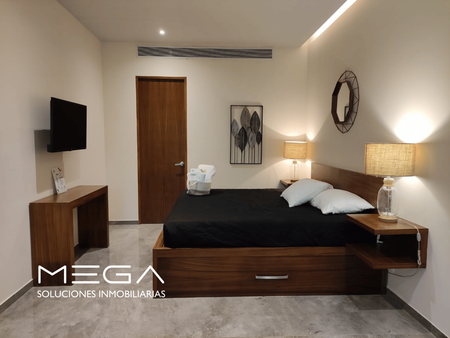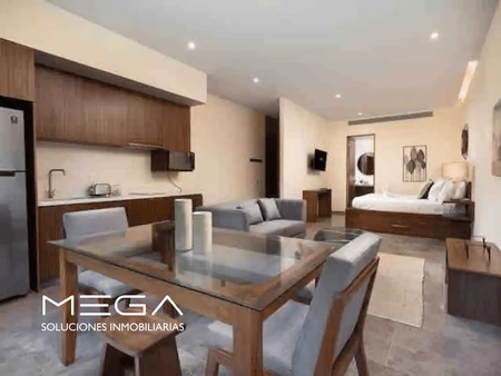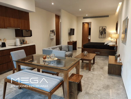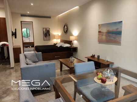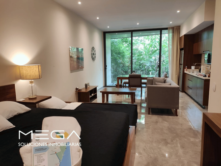 Amplio departamento tipo estudio con 1 cama king Size y una desplegable inferiror matrimonial, sala de estar y antecomedor con terraza y jardín privado. Ubicado en Mistiq Tulum 1, uno de los desarrollos más deseados de Tulum con excelente ubicación sobre la Av. Kukulkan que desemboca en la zona hotelera y de playas; el desarrollo cuenta con Mercadito, Restaurante y plata de tratamiento de agua de osmosis inversa por lo que el agua es 100% potable, además de tener uno de los gimnasios mejor equipados de Tulum. A 5 minutos de La Veleta, donde se encuntran gran variedad de restaurantes, comercios locales y tiendas diversas. El amueblado del departamento es de maderas macizas locales como Tzalam. Totalmente equpido y listo para usar/operar en plataformas de renta vacacional.