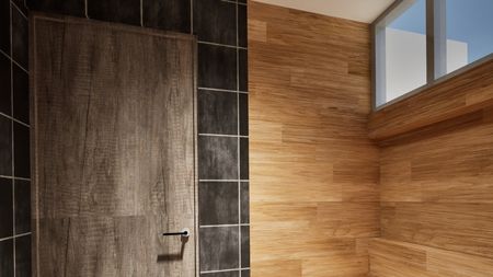 Pared decorativa con lambrín de madera y metal, que aporta un estilo industrial único.