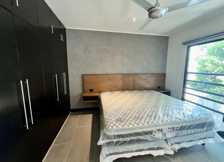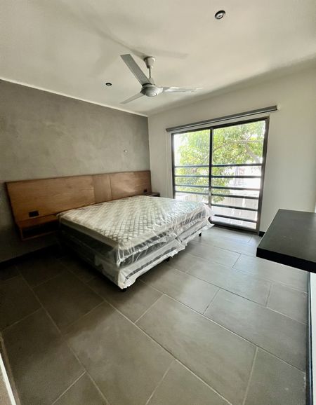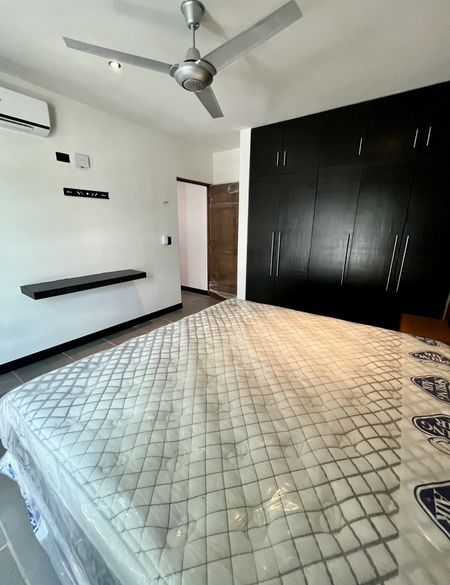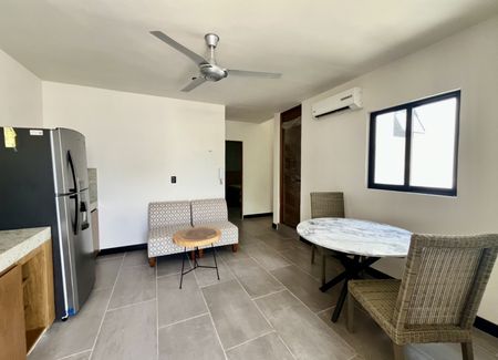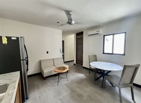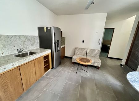 El departamento tiene una recámara con clóset , baño completo , área de sala comedor , cocina equipada con parrilla eléctrica , microondas , refrigerador. Ventilador , A/A, calentador eléctrico