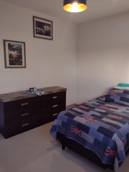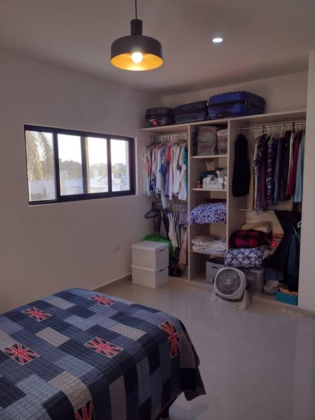 Una amplia y cómoda recamara con closet con carpintería, cama matrimonial, aire acondicionado inverter, abanico de techo, comoda con 6 cajones.