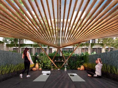 Yogashala, • Grill zone, • Kids room, • Agrihood, • Gym, • Business center, • Games room, • Bar, • 2 swimming spots, • Seguridad 24/7, • Meditation zone, • Padel court