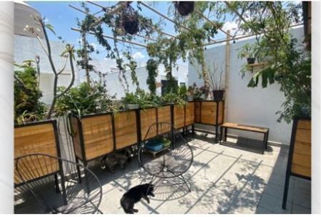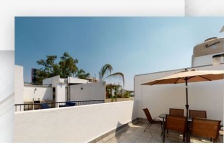 Cuenta con 88.4m2, habitables , 2 habitaciones, 2 baños completos y un medio baño para visitas, azotea de 7.5 m2, cuarto de lavado, roof garden de 25 m2 espacio de 2 bodegas y 3 cajones para estacionamiento.