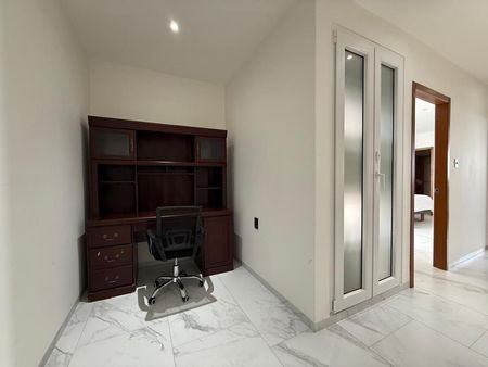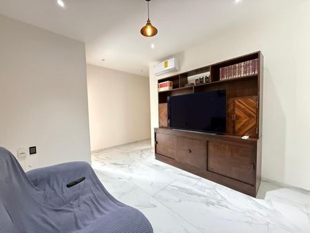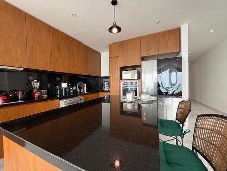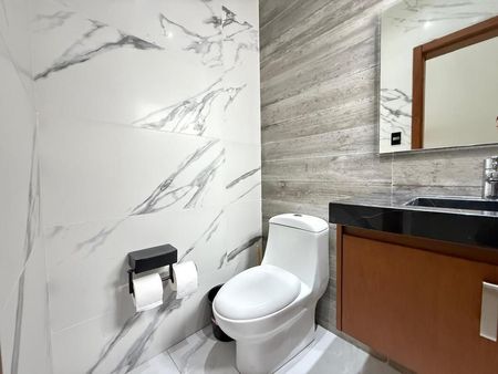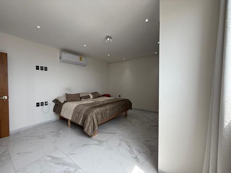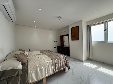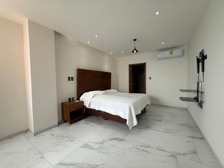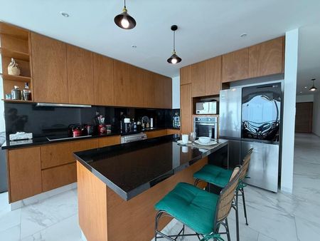 Departamento de 3 recámaras cada una con vestidor, 4 baños completos totalmente equipados, sala comedor, cocina integral equipada con parrilla, horno, campana y barra de granito, cuarto de TV, estudio, medio baño de visitas, cuarto de lavado y planchado, cuarto de servicio con baño, balcones, bodega y garage para 2 autos.