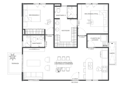 Baño completo: Ubicado cerca de la sala y la recámara secundaria.
