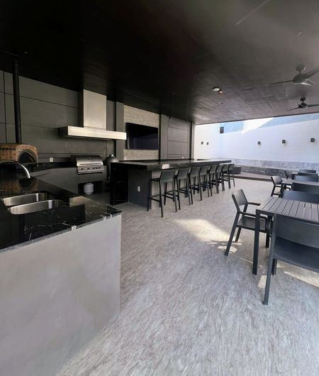 Cocina equipada con electrodomésticos y barra de cuarzo.