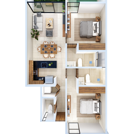 Parrilla eléctrica, gavetas inferiores y superiores en cocina, closets vestidos, cancel fijo de cristal templado en baños, gavetas inferiores en baños.