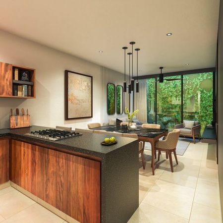 Características: Altura 2.80, pisos cerámicos 60 x 60, piso de concreto estampado en estacionamientos, acabado exterior a 3 capas con acabado estuco, acabado interior de yeso, cancelería línea de 3 6 mm, meseta granito en cocina, tinaco, cisterna.