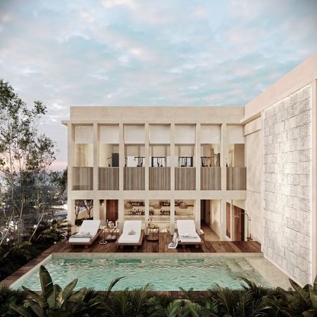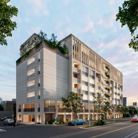 Torre de 8 niveles que consta de 44 departamentos de una recámara y 8 penthouses duplex de 2 recámaras con sistema lock off.