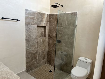 Habitación elegante y cómoda, con baño completo que incluye cancelería en negro mate, cancel de cristal templado y piso antiderrapante en zona húmeda.
