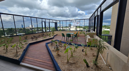 Cuarto nivel un jardín vivo o roofgarden, con vegetación (jardín, árbol, plantas de varios tipos)
