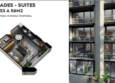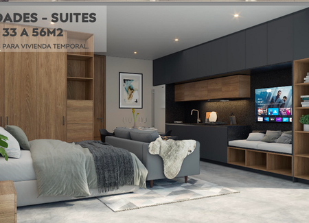 Suites (33 a 56 m2): Perfectas para vivienda temporal, estas unidades ofrecen espacios funcionales y modernos, adaptados a tu estilo de vida.