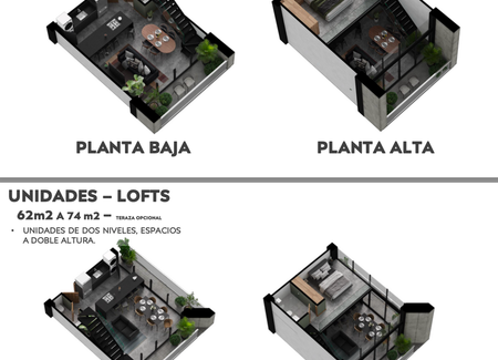 Lofts (62 m2 a 74 m2): Disfruta de unidades de dos niveles con espacios a doble altura, y la opción de terrazas para mayor comodidad y disfrute al aire libre.