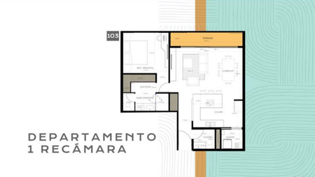1 Recámara, vestidor, 1 baño y medio, sala, comedor, terraza, cocina integral, centro de lavado, closet de blancos y 1 estacionamiento techado.