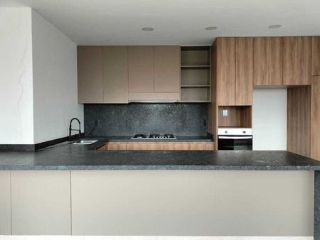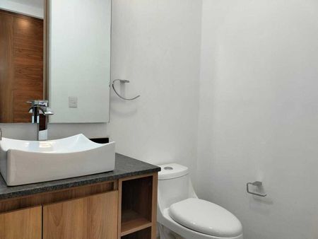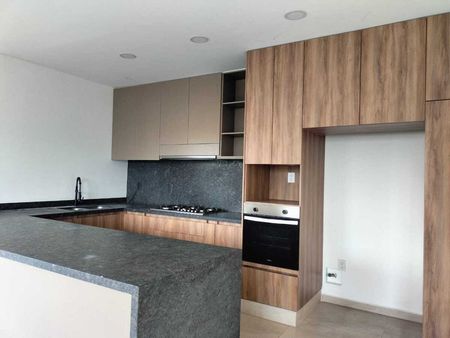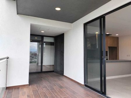 Departamento con recámara principal con vestidor y baño, recámara secundaria con closet y baño, medio baño de visitas, sala, comedor, cocina integral y terraza.