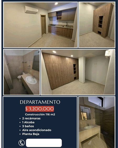 Departamento Planta Baja – $3,200,000 2 recámaras + alcoba | 3 baños | 116 m² | aire acondicionado