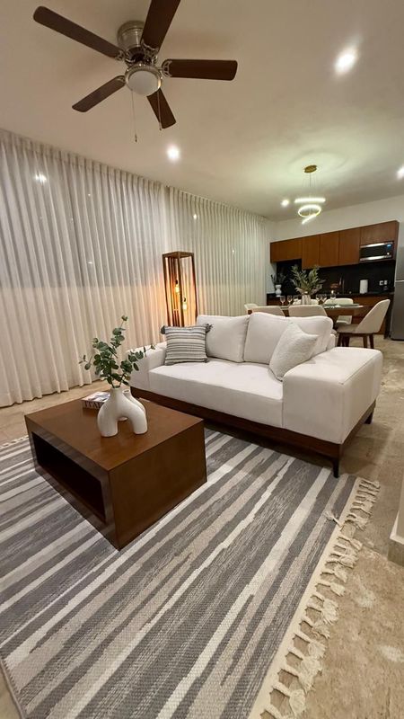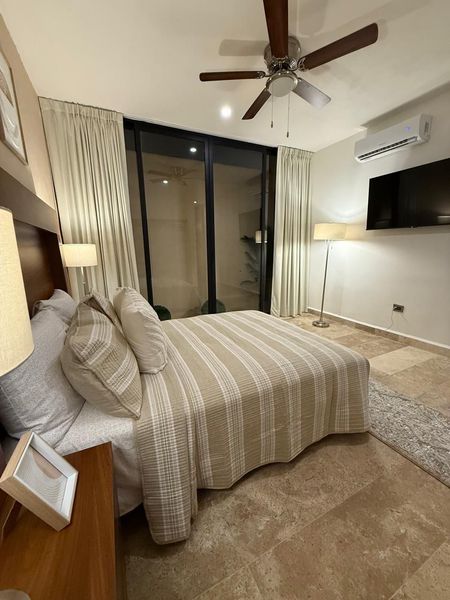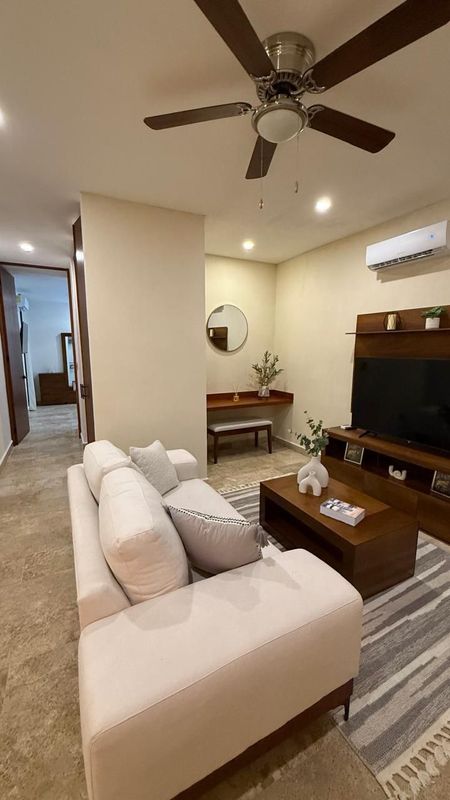 además cuenta con ventilador de techo, luminarias y pisos de marmol.