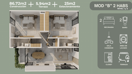 - 2 Recamaras con closet