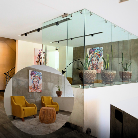 Cocina integral en “L” con estufa y campana integrada" Ventanales de piso a techo para mayor iluminación natural
