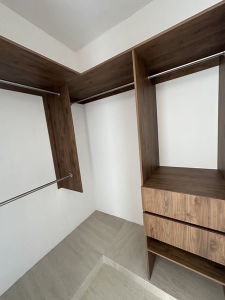 Recámara principal con closet vestidor y baño y recámara secundaria con closet de pared y baño .