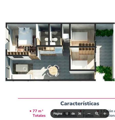 Este depa esta en 1er piso, exterior y cuenta con 3 recámaras, 2 baños y 1 estacionamiento distribuídos en 64.37m2 de interiores + 12.71m2 de terraza.