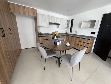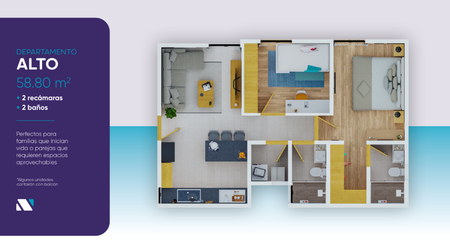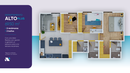 En este proyecto tenemos dos modelos de departamentos: 59 m2 y 70 m2 con dos recámaras, dos baños completos, uno o dos cajones de estacionamiento, cocina integral, sala-comedor y cuarto de lavado. Algunos cuentan con estudio y balcón.