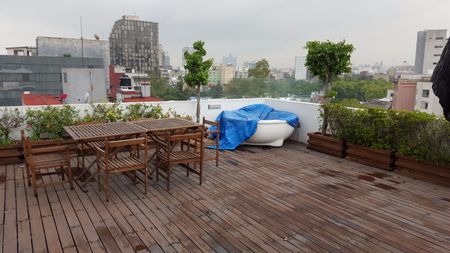 Roof garden con asador, tarja, jacuzzi, y área techada con madera de teka y vidrio templado